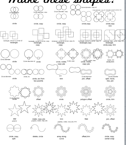 Above is the completed list of examples. I was comfortable with most, but the offset commands, split command, and the last four curve examples I will need more assistance on.